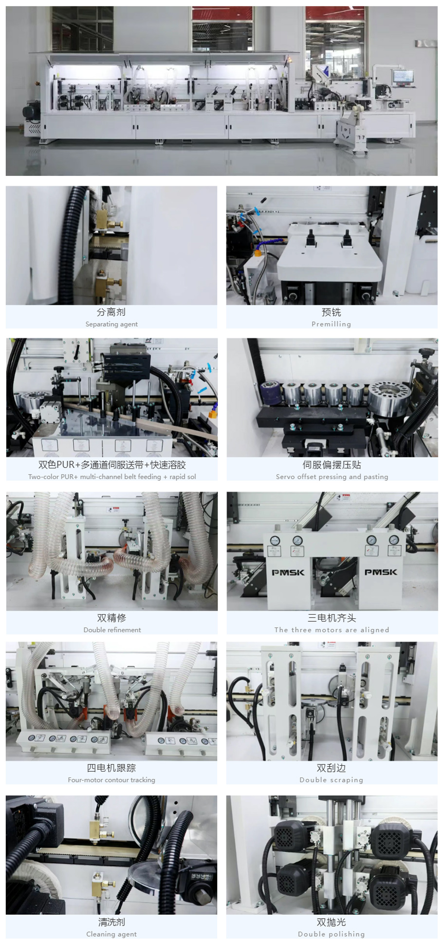 伺服升降壓梁結(jié)構(gòu),精準(zhǔn)控制,實現(xiàn)不同厚度板材封邊快速調(diào)節(jié)。
